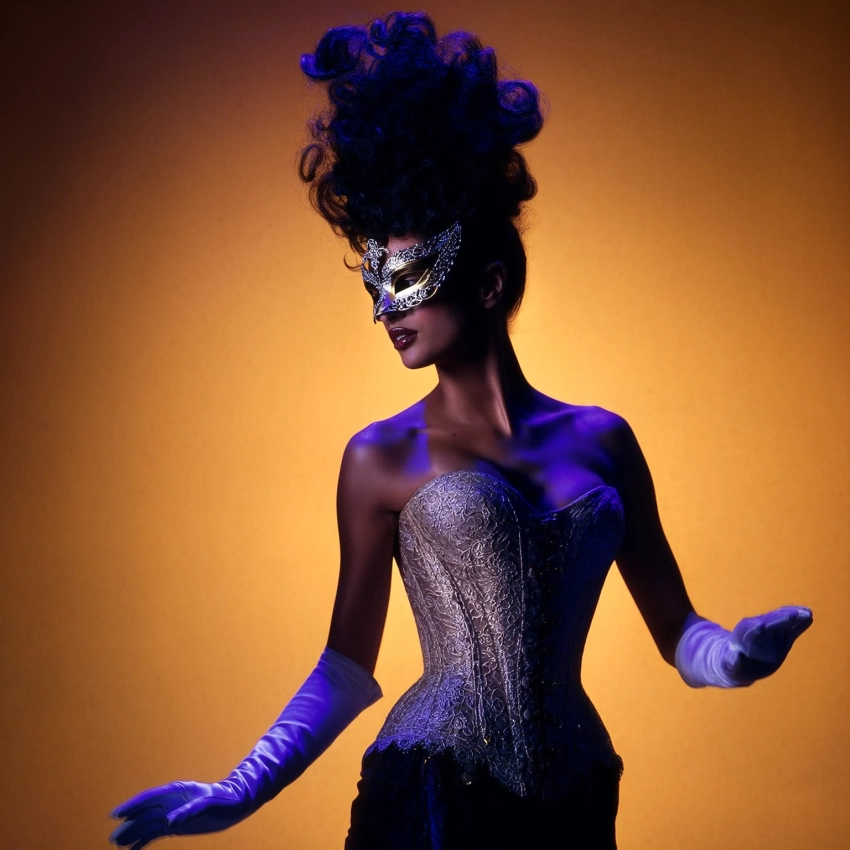 Корсет, кружевные перчатки, маска и высокая прическа — всё, чтобы стать героиней таинственного бала. Этот образ добавит роскоши и загадочности вашему празднику.