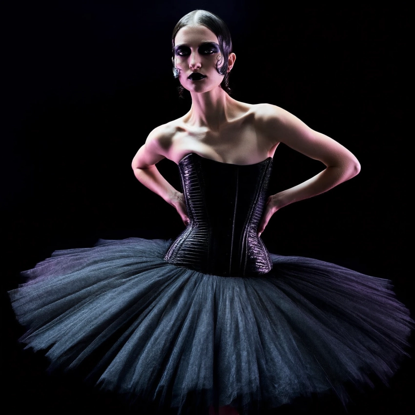 Классический балетный образ в мрачной интерпретации. Юбка, плотный корсет и выразительный макияж глаз — драматично и красиво.