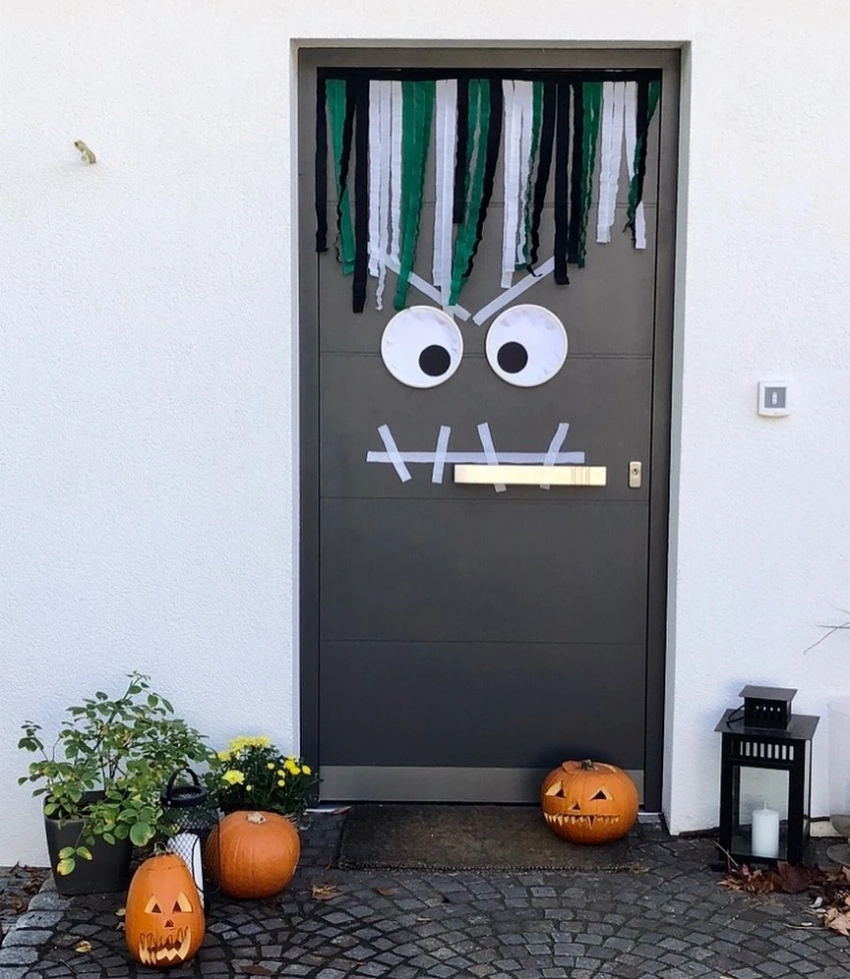 Вырежьте рожицу в тыкве, вставьте свечу и подвесьте за проволоку у входа — классика Хэллоуина, которая встречает гостей загадочным светом.