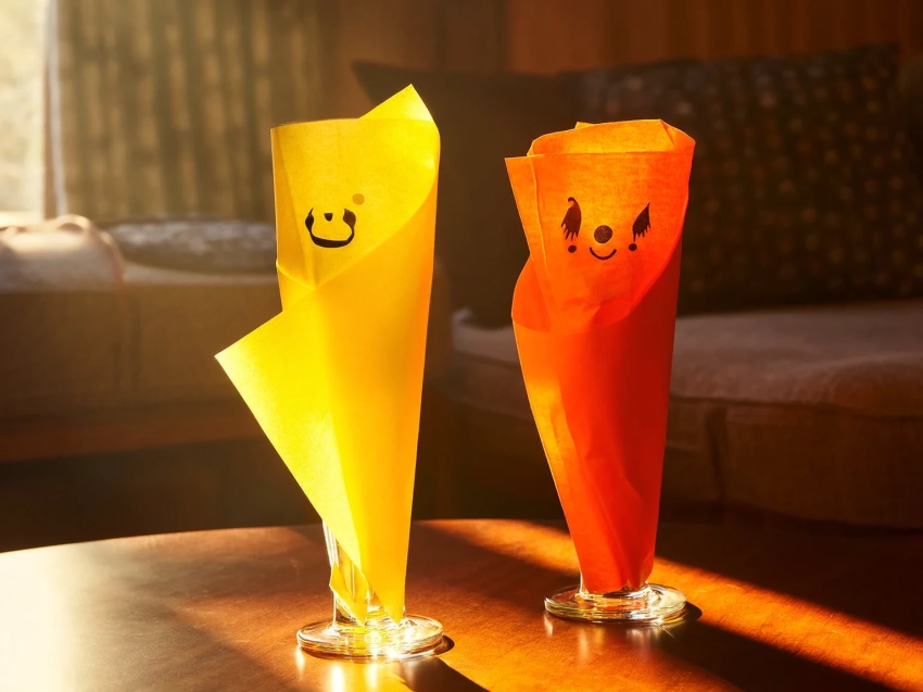Обёрните стеклянный стакан желтой и оранжевой бумагой с вырезанным лицом — свеча внутри создаст мягкий, но пугающий свет.