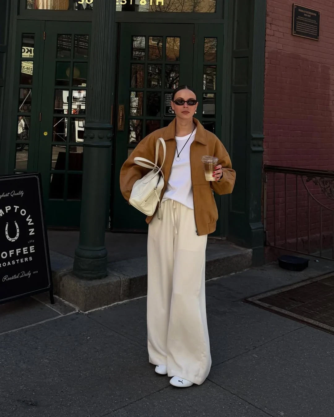 Белые брюки + замша цвета кэмел