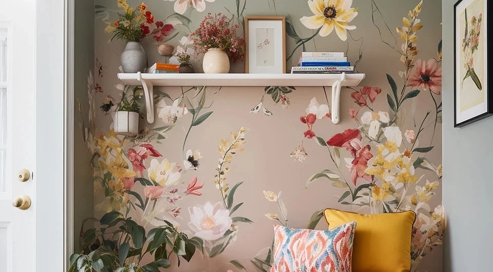 Цвета — сложные и благородные: припылённый синий, травяной зелёный, оттенки земли, мягкий розовый, приглушённый жёлтый. Чтобы интерьер не выглядел перегруженным, такую отделку сочетают с однотонной мебелью и сдержанным декором.
