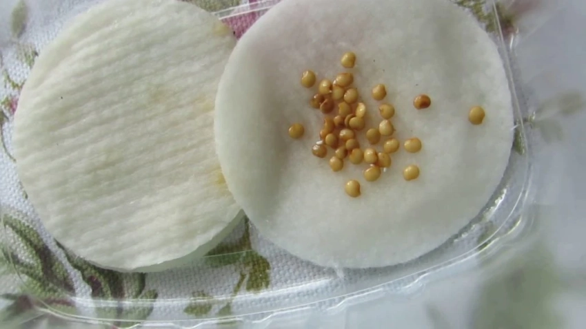 Разложите семена. Поместите их на влажную ткань, марлю, ватные диски или фильтровальную бумагу. Сверху накройте вторым слоем влажного материала.