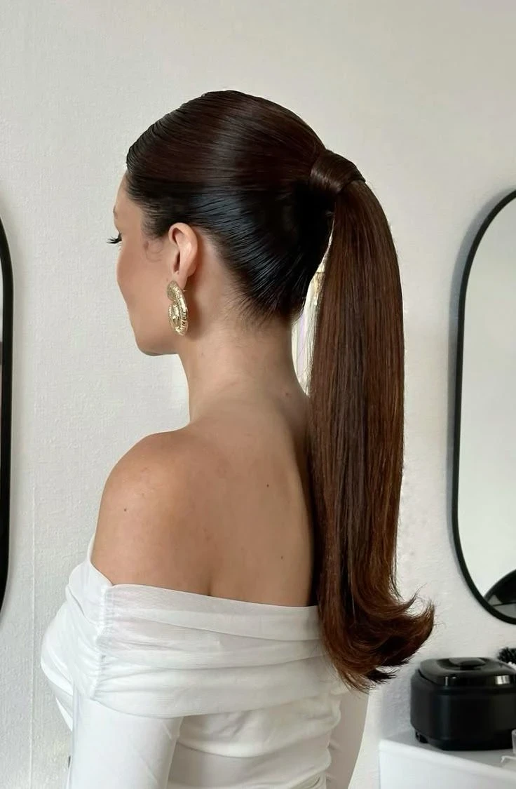Минимум усилий — максимум эффекта. Идеально приглаженные корни придают прическе собранность, а хвост вытягивает овал лица и шею.