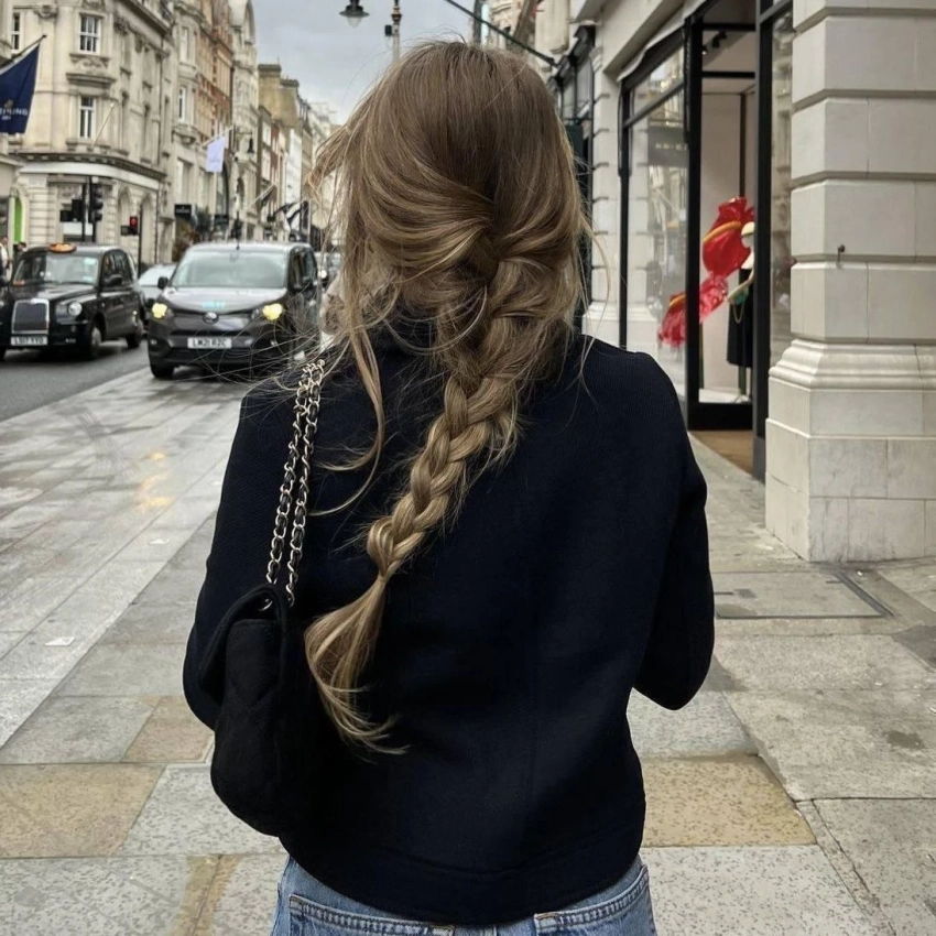 Трехпрядная коса через плечо — практичность и романтика в одном решении. Идеальна в дождливую погоду.