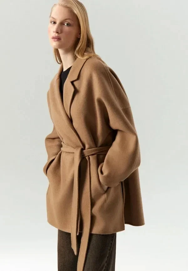 Цвета сезона — от классического кэмела до серо-голубых оттенков и мятного. Халат дает умеренное тепло, поэтому продумай многослойность или выбирай его для не самых морозных дней. Главное правило: не перегружай аксессуарами — минималистичные серьги и простая сумка идеально завершат образ.