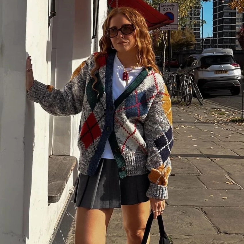 Ромбовый узор снова в моде — но теперь в современной интерпретации. Свитера, жилеты и кардиганы с этим рисунком стали символом умного городского стиля. Они легко вписываются в многослойные образы, добавляя текстуру и визуальную глубину.