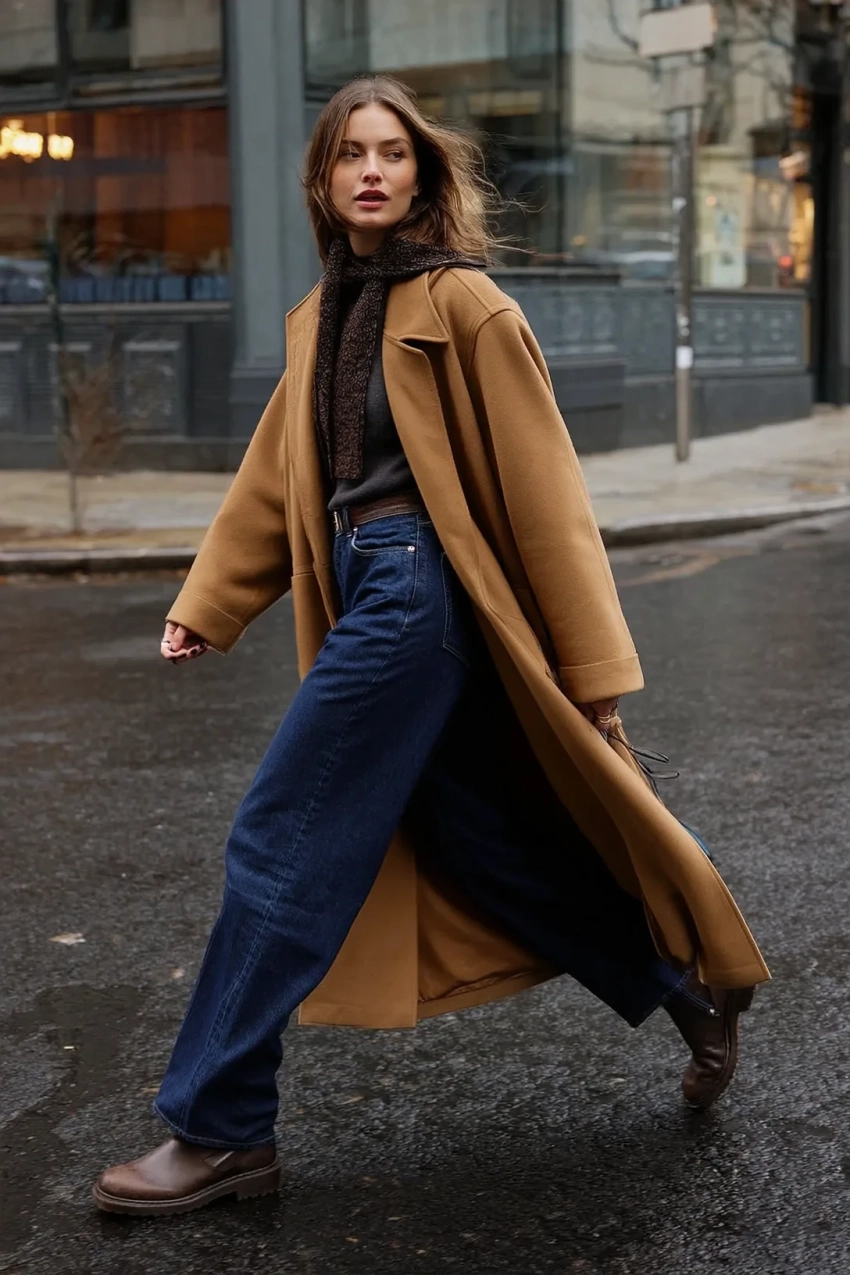 Сочетайте такие джинсы с белой рубашкой, кашемировым свитером, объемным пальто или пуховиком. Для завершения образа добавьте кожаный ремень и ботинки на грубой подошве — получится сдержанный и стильный look в духе эстетики old money.