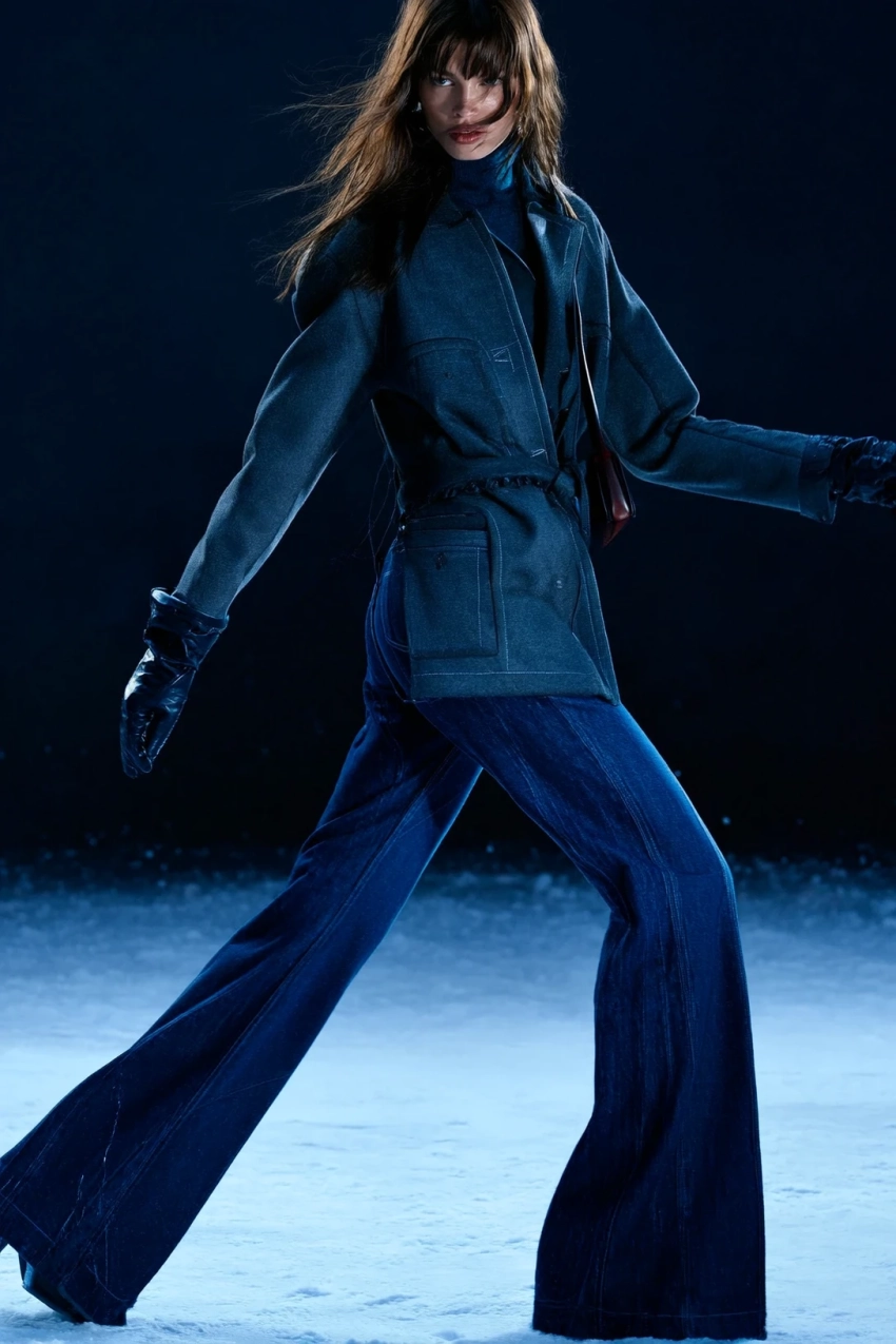 Для зимы выбирайте плотный деним и сочетайте его с укороченными пальто, дубленками или куртками из овчины, добавив водолазку нейтральных оттенков.