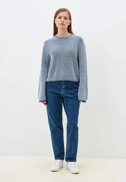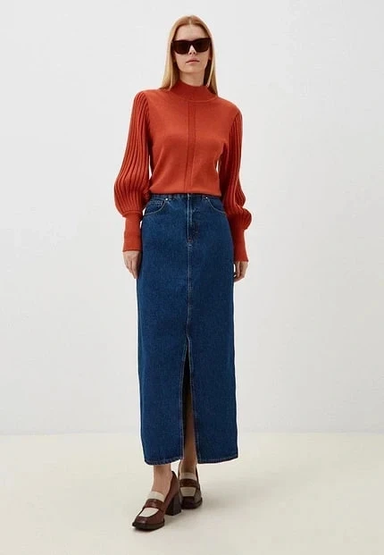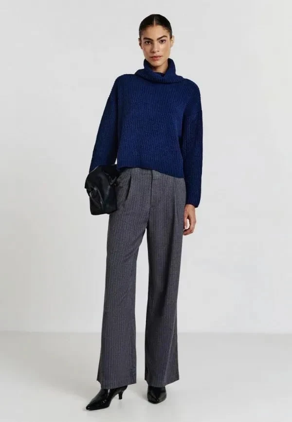Синие брюки и серый кардиган, серая джинсовая юбка и синий свитшот — такие дуэты работают и в офисе, и в городе.