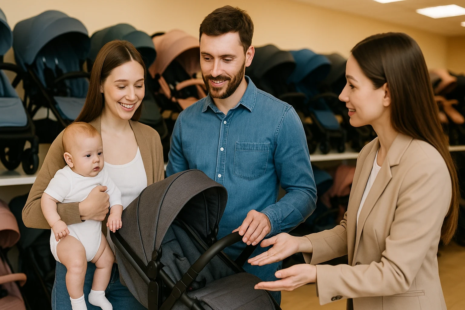 - Частые ТРЦ и кафе: цельная ручка, ширина шасси до 50–52 см, стопор поворотных колёс.