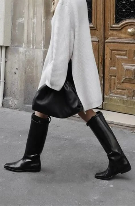 Строгие высокие сапоги из плотной кожи или замши.