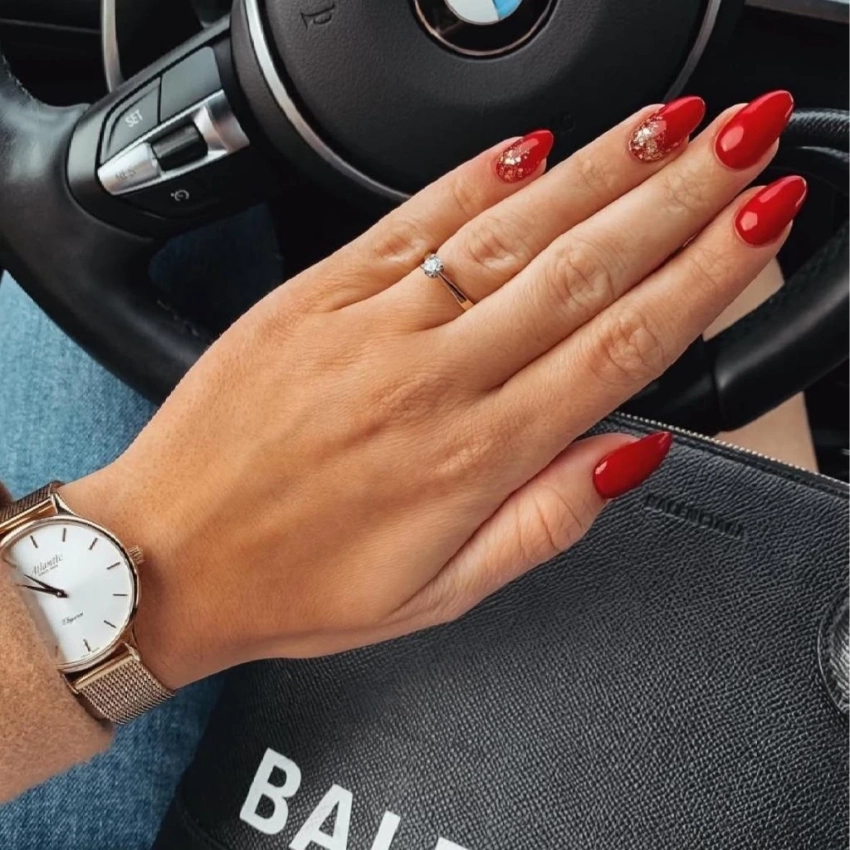 Не отказывайтесь от сплошного покрытия! В тренде — глубокие, сложные оттенки: ягодный бургунд, терракотовый красный, темный «красное вино». Секрет современной классики — в безупречной форме (мягкий квадрат или миндаль) и в одной-единственной детали. Добавьте к такому маникюру тонкую полоску сусального золота или серебра у кутикулы на одном или двух пальцах, или сделайте «золотую лунку». Это мгновенно делает образ дорогим и праздничным.