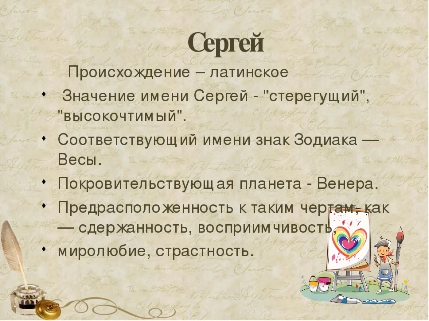 Имя Сергей, происходящее из латинского языка, переводится как «высокочтимый» и уже многие века остаётся одним из самых популярных не только в России, но и во Франции, а также в странах Пиренейского полуострова. Обладатели этого имени, как правило, отличаются жизнерадостным нравом, острым умом и широтой интересов. Сергей легко находит общий язык с людьми, умеет поддержать, вдохновить и всегда готов прийти на помощь.