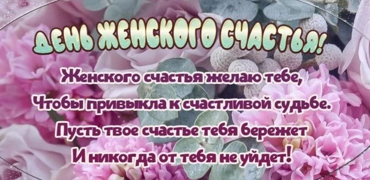 В День женского счастья желаю всего самого хорошего! Чтобы жизнь ваша была наполнена самыми радостными моментами. Чтобы все, кто вас окружают, дарили тепло, любовь и взаимопонимание.
