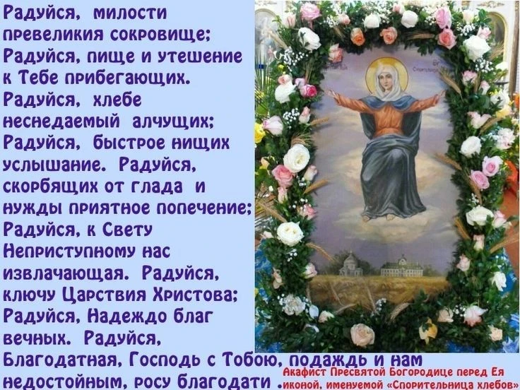 О, Пресвятая Дево Богородице, Премилостивая Владычице, Царице Небесе и земли, всякаго дома и семейства христианскаго Благоустроительнице, труждающихся благословение, нуждающихся неистощимое богатство, сирых и вдовиц и всех людей Кормительнице! Питательнице наша, рождшая Питателя Вселенныя и Спорительнице хлебов наших, Ты, Владычице, ниспосылаеши Твое Матернее благословение градом нашим, селам и нивам и коемуждо дому, на Тя упование имущему. Темже с благоговейным трепетом и сокрушенным сердцем смиренно молим Тя: буди и нам, грешным и недостойным рабом Твоим, мудрая Домостроительнице, житие наше добре устрояющая. Всякое же сообщество, всякий дом и семейство во благочестии и православии, единомыслии, послушании и довольстве соблюди. Нищия и неимущия пропитай, старость поддержи, младенцы воспитай, всех вразуми преискренне взывати ко Господу: “Хлеб наш насущный даждь нам днесь”. Сохрани, Пречистая Мати, люди Твоя от всякия нужды, болезни, глада, губительства, града, огня, от всякаго злаго обстояния и всякаго нестроения. Обители нашей (веси), домам и семействам и всякой души христианстей и всей стране нашей исходатайствуй мир и велию милость, да славим Тя, Премилостивую Питательницу и Кормительницу нашу, ныне и присно, и во веки веков. Аминь.