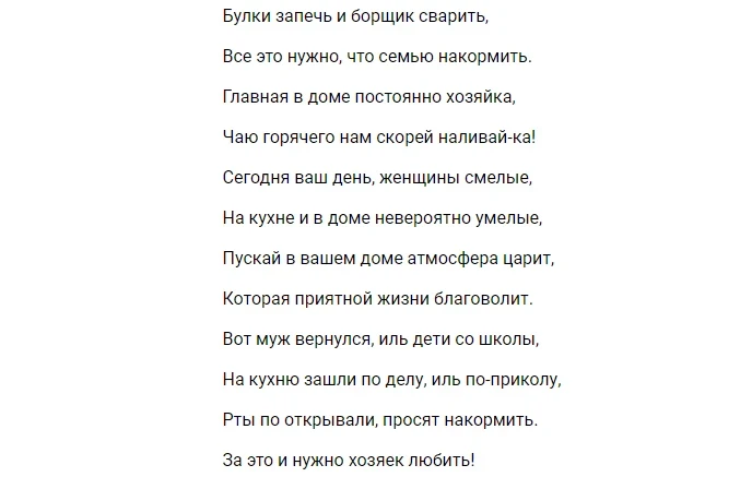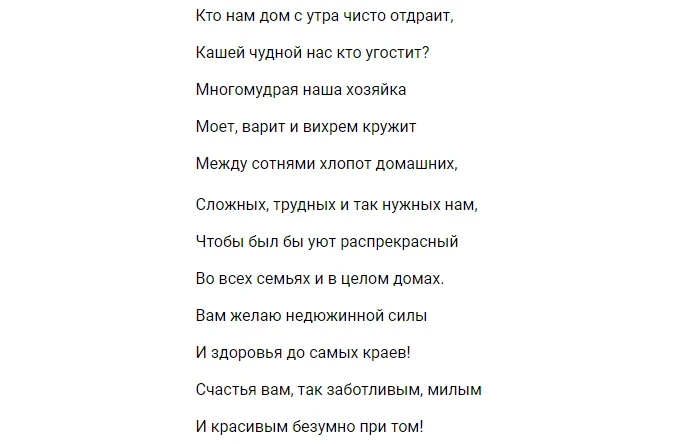 В праздничный день принято поздравлять всех тех, кто много сил вкладывает в улучшение жилищных и бытовых условий. Домохозяек можно поздравить своими словами или же подобрать красивое поздравление либо открытку.