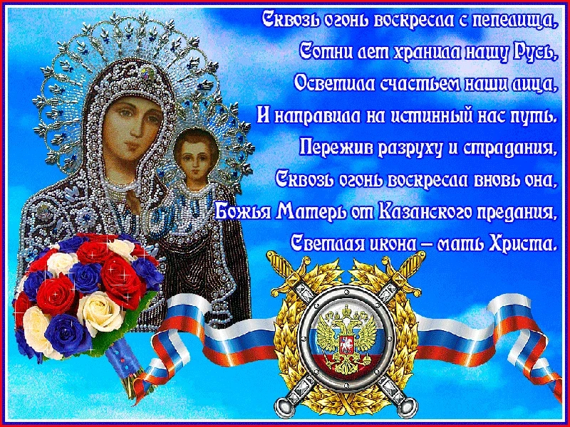 С днем Казанской иконы Божьей Матери и Днем народного единства! Пусть образ Богородицы хранит вас от боли, от бед, всякого зла и недругов. Желаю вам мира, тепла, достатка, благополучия и здоровья. Пускай Казанская икона станет вашим надежным оберегом!
