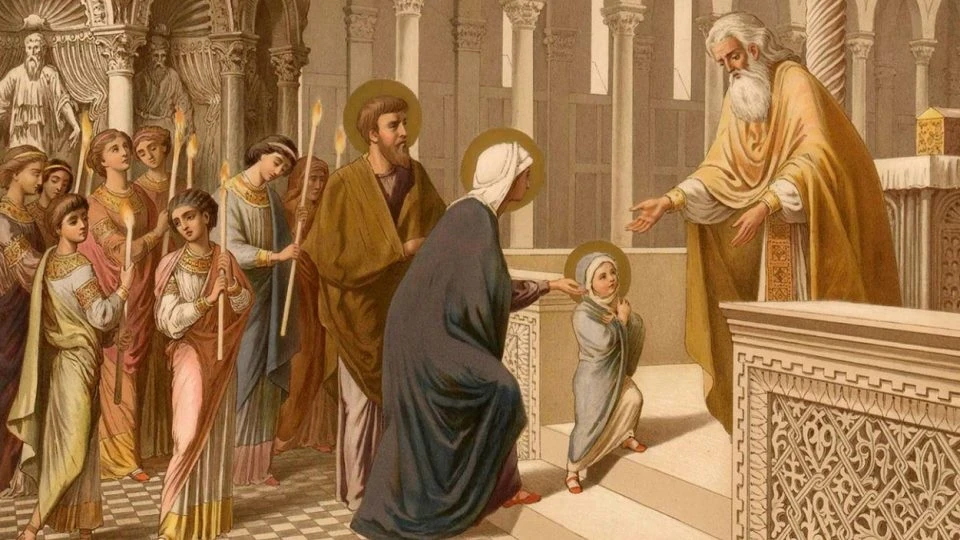 Когда Марии исполнилось три года, родители с благоговением привели ее в Иерусалимский храм, исполняя свое святое обещание. По преданию, первосвященник, ведомый духовным вдохновением, ввел девочку в Святая Святых — место, доступное лишь раз в году. Здесь Мария росла, посвящая свои детские и юношеские годы молитве, чистоте и духовным подвигам.