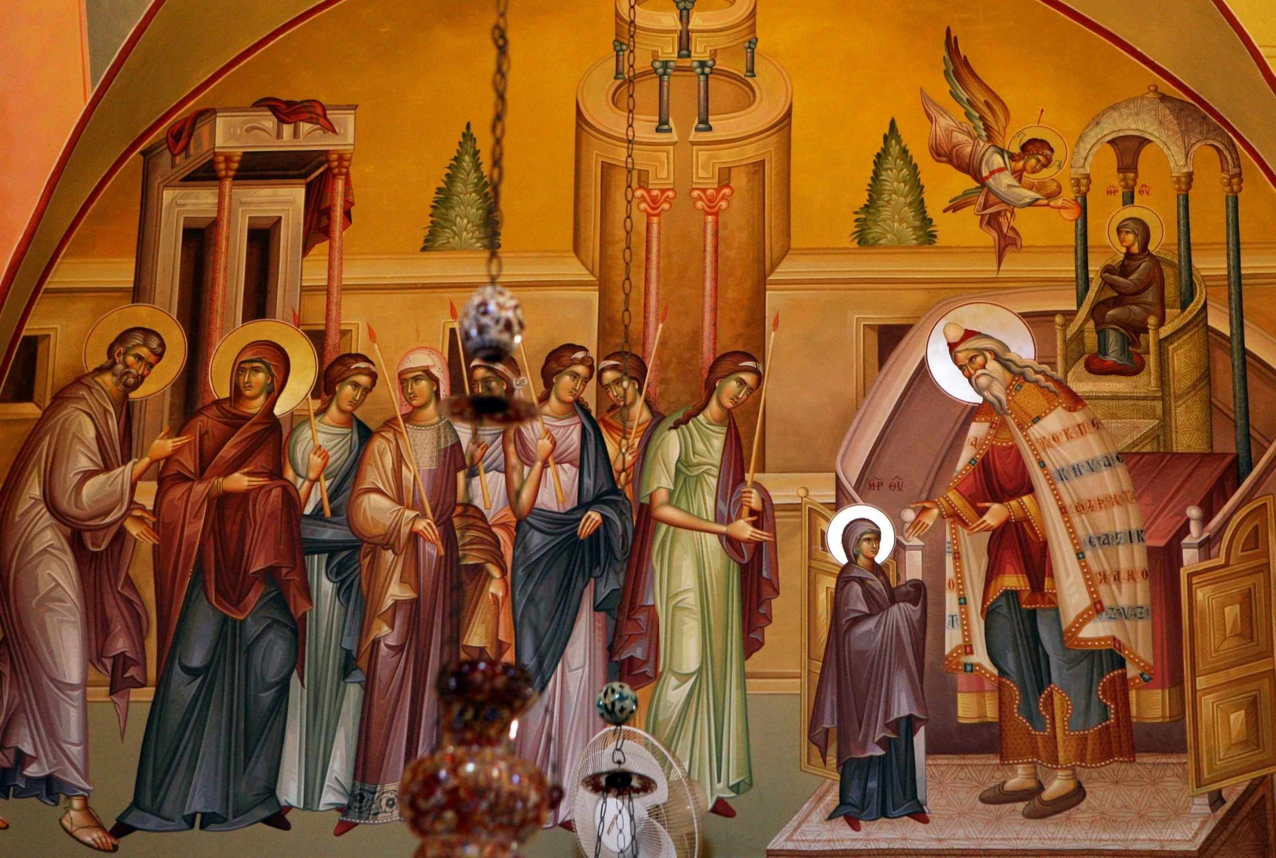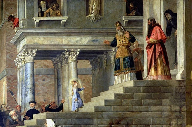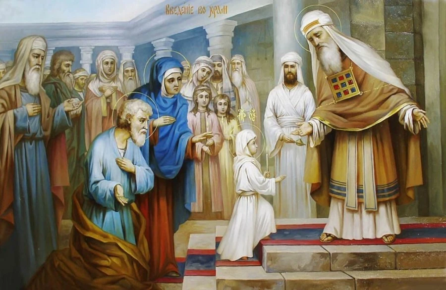 День, когда маленькую Марию повели в Иерусалимский храм, стал по-настоящему торжественным и проникнутым священным смыслом. С зажжёнными свечами, молитвой и гимнами её сопровождали родные и близкие. У входа в храм Деву Марию встретил первосвященник Захария. Против всех установленных правил он ввёл её по пятнадцати ступеням прямо в Святое Святых — место, куда не мог войти ни один человек, кроме первосвященника. Этот необычный поступок был знамением особого предназначения Марии.