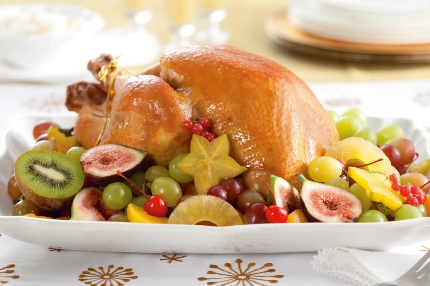 - Птица. Курица, индейка, утка с фруктами, медом или специями (утка с яблоками, индейка с апельсинами).