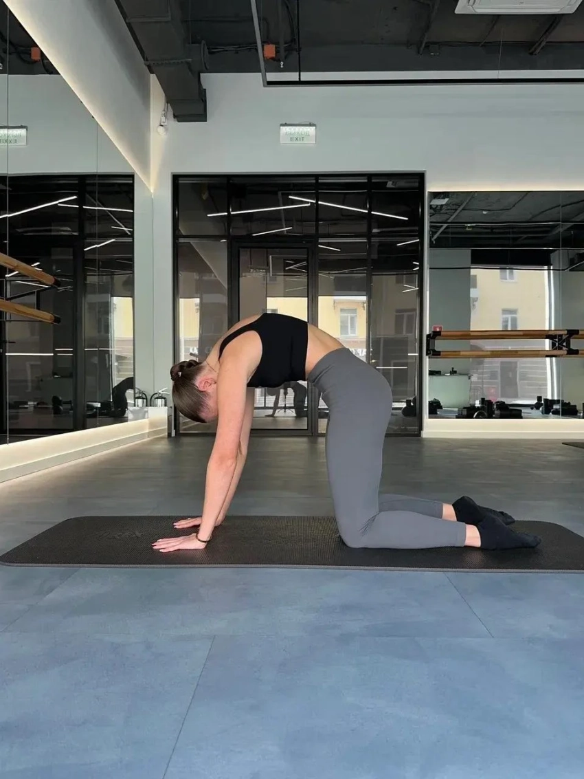 Встаньте на четвереньки. На выдохе медленно округляйте спину, позвонок за позвонком. На вдохе — мягко прогнитесь, вытягивая позвоночник от таза до шеи.