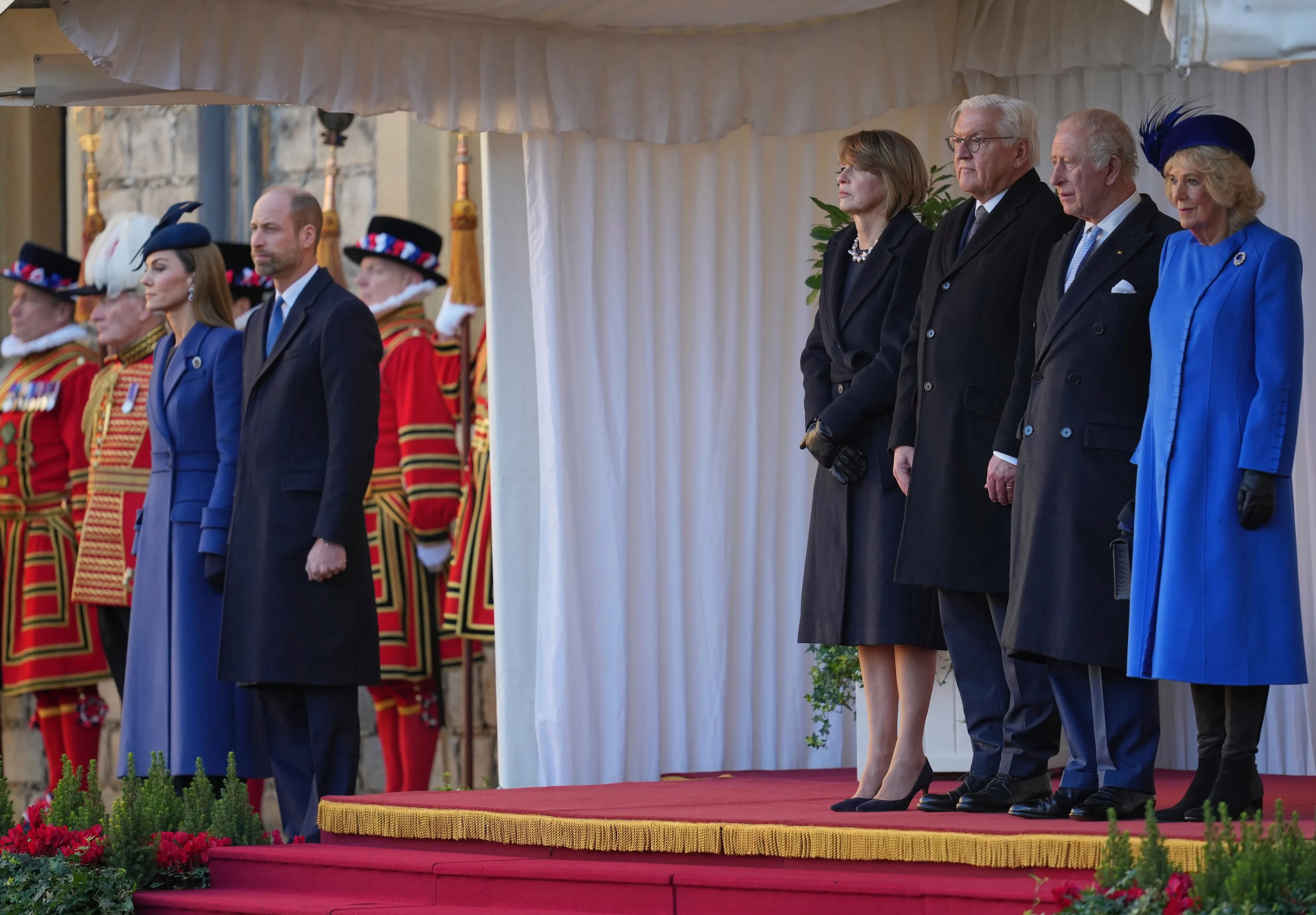 Принц Уильям и Кейт Миддлтон78-летняя королева Камилла, как и Кейт, вышла в пальто синего цвета во время приветствия Франка-Вальтера Штайнмайера и его супруги. Это первый за 27 лет визит главы Германии в Великобританию, в ходе которого состоятся торжественные визиты в парламенте и банкет.
